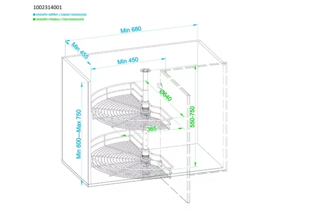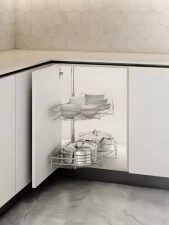 Praktický otočný karusel s dvomi polkruhovými košmi je ideálnym riešením pre efektívne využitie úložného priestoru v rohových kuchynských skrinkách. Umožňuje prehľadné usporiadanie a pohodlný prístup k uloženým predmetom. Karusel je výškovo nastaviteľný v rozmedzí 550 – 750 mm, čo zaručuje flexibilitu pri montáži.