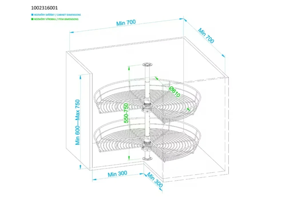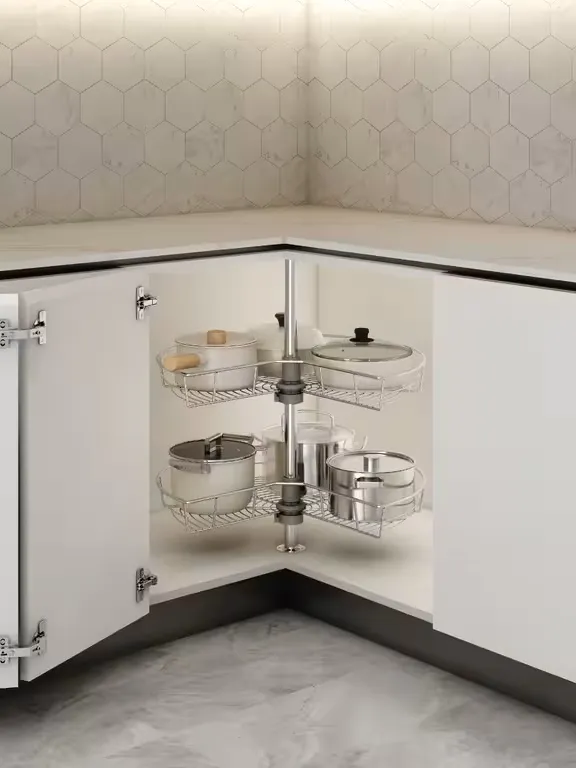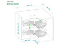 Štýlový otočný karusel s dvomi košmi umožňuje pohodlné a prehľadné uloženie kuchynských potrieb v rohových skrinkách. Vďaka otočnému mechanizmu s uhlom 270° získate maximálny prístup k uloženým veciam. Karusel je výškovo nastaviteľný v rozmedzí 550 – 750 mm, čo zaručuje flexibilitu pri montáži.