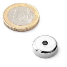 Magnet je osadený v oceľovom puzdre a vybavený otvorom s priehlbňou pre skrutku M3, čo umožňuje pevné a stabilné uchytenie do korpusu skrinky alebo konštrukcie nábytku. Je vyrobený z NdFeB (trieda N42) a pre vyššiu odolnosť proti korózii je poniklovaný (Ni-Cu-Ni).