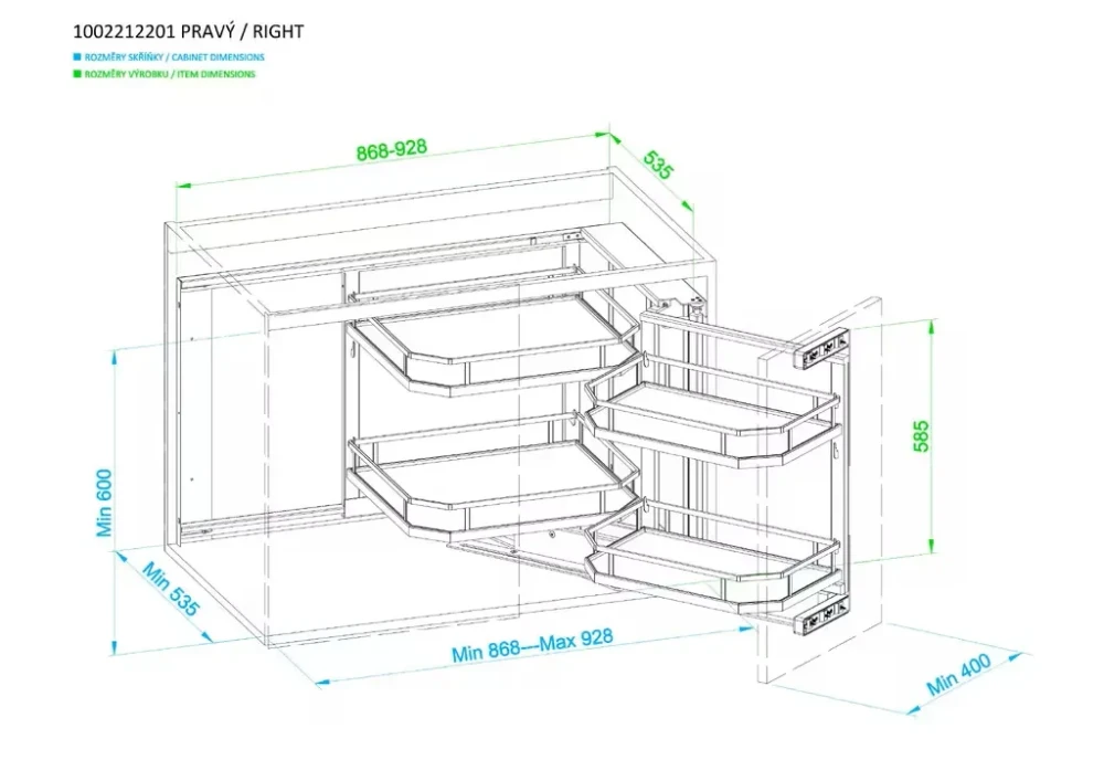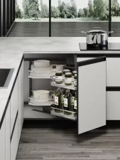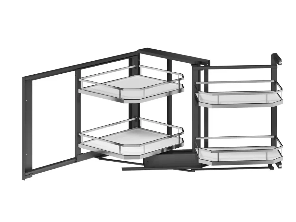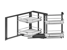 Prémiové riešenie pre rohové skrinky, ktoré kombinuje elegantný vzhľad s maximálnou funkčnosťou. Vďaka výsuvnému rámu s tlmením sa koše vysunú do priestoru a sprístupnia aj inak nedostupné časti slepého rohu. Chrómové koše s plným dnom a protišmykovou úpravou udržia uložené veci stabilne a bezpečne.