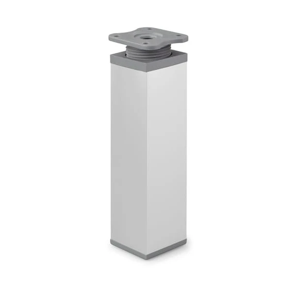 Štvorcová hliníková nožička s reguláciou výšky, určená pre kuchynské a kúpeľňové skrinky, komody, skrinky a doplnkový nábytok. Slúži na stabilizáciu, vyrovnanie a vizuálne oddelenie nábytku od podlahy. Výšková regulácia do 20 mm umožňuje presné vyrovnanie pri nerovnostiach podlahy. Spodná plastová pätka chráni podlahu pred poškriabaním. Nožička nie je nosná. Nábytok musí byť vždy pevne ukotvený do steny v súlade s montážnymi pokynmi výrobcu.