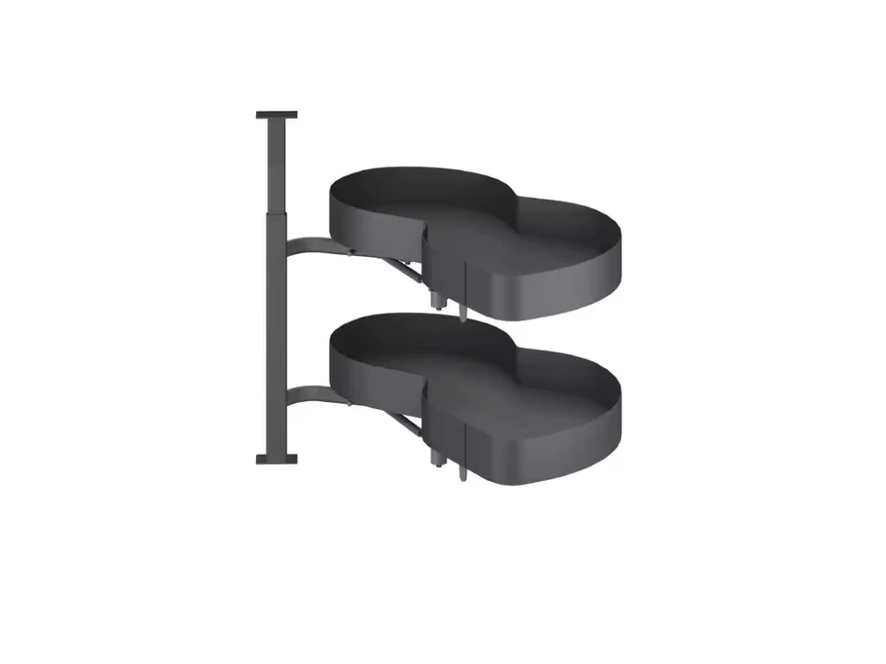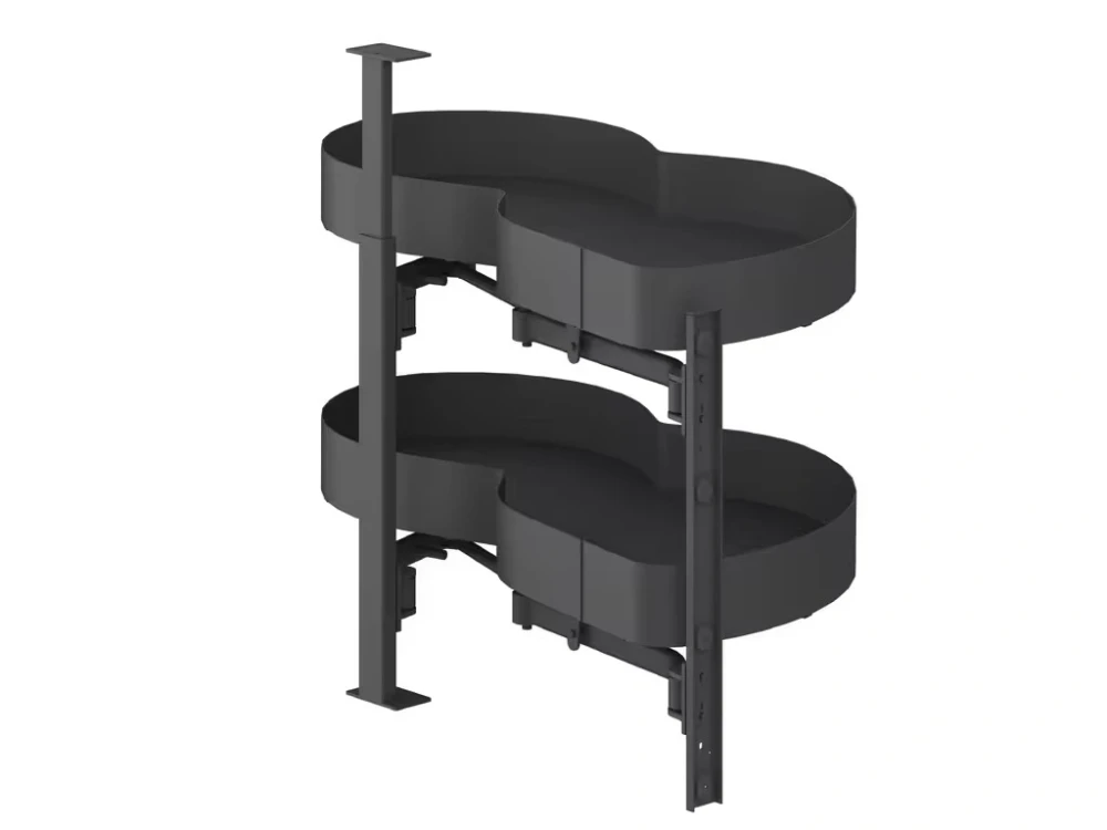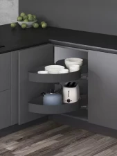 Elegantné a praktické riešenie pre rohové kuchynské skrinky s maximálnym využitím priestoru. Výsuvné police sa vysúvajú do priestoru, čím zabezpečia ľahký prístup k uloženým veciam. Kvalitné tlmiče zabezpečujú tiché a plynulé dovieranie, zatiaľ čo protišmykový povrch uchová uložené predmety bezpečne na svojom mieste.