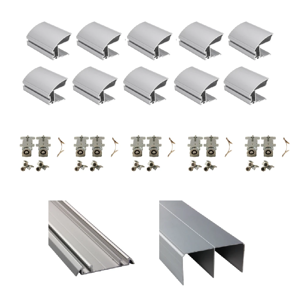 Sada kovania pre skriňu s piatimi dverami dĺžky do 4m. Trend Line sada je ucelené riešenie kovania na posuvné dvere vstavaných skríň s jednotným dizajnom. Všetky komponenty sú zladené v jednej dizajnovej línii, vďaka čomu pôsobí výsledná skriňa čisto, moderne a profesionálne.