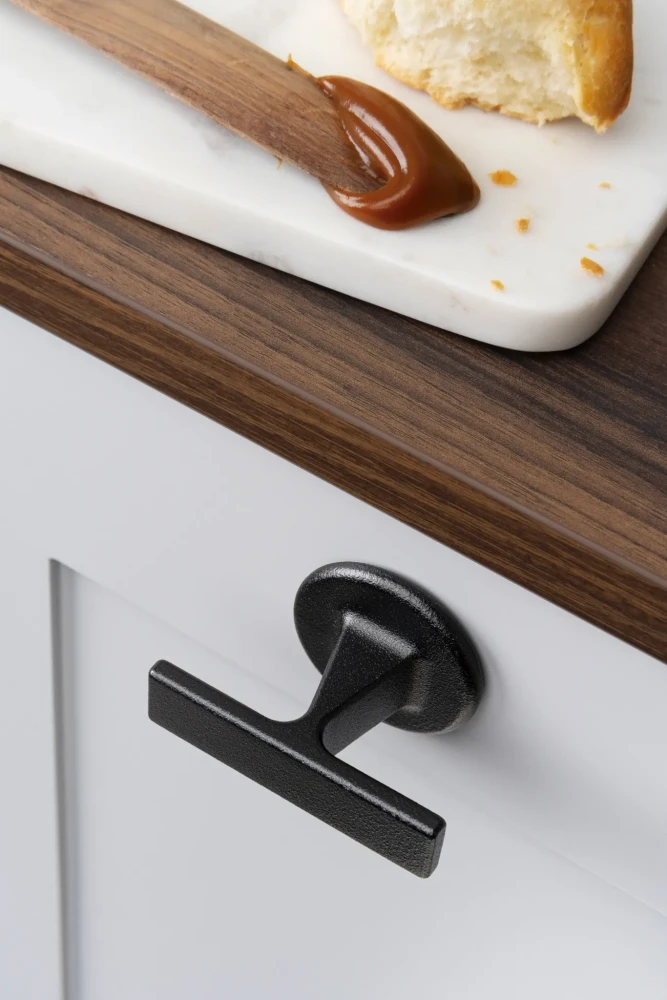 Úchytka OTO od značky Viefe, navrhnutá dizajnérom Bernat Llonch, zaujme charizmatickou čiernou textúrovanou povrchovou úpravou a robustným vzhľadom s jemne zaoblenými hranami. Je vyrobená zo zamaku a kombinuje vintage charakter s moderným výrazom, vďaka čomu pôsobí nadčasovo a zároveň veľmi súčasne.