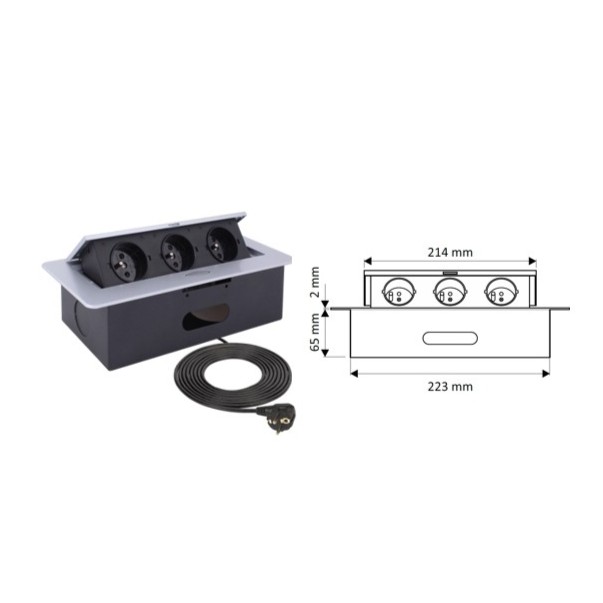Moderná výklopná zásuvka do pracovného stola alebo kuchynskej linky. Moderný hranatý dizajn. Po stlačení tlačidla sa automaticky vysunie panel so zásuvkami. Zásuvka je určená iba pre interiéry. Zásuvka sa jednoducho zapojí vidlicou do siete.